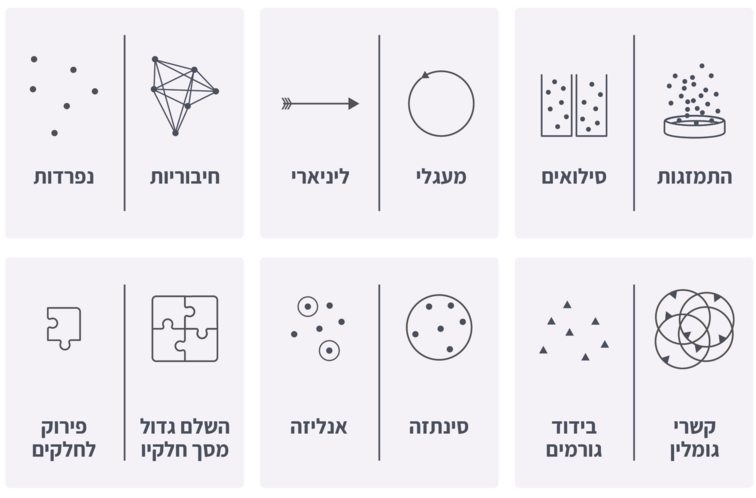 כיוון שהמערכות מורכבות, אין מודל אחד שנותן לנו תמונה מלאה. החיבור בין כלים ומודלים שונים (כפי שיפורט בהמשך) והאינטגרציה שלהם להבנת הנרטיב והדינמיות של המערכת – הוא הוא המפתח לזיהוי נקודות התערבות פוטנציאליות.